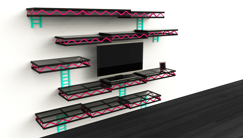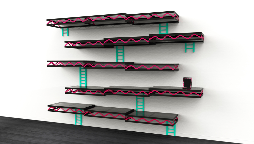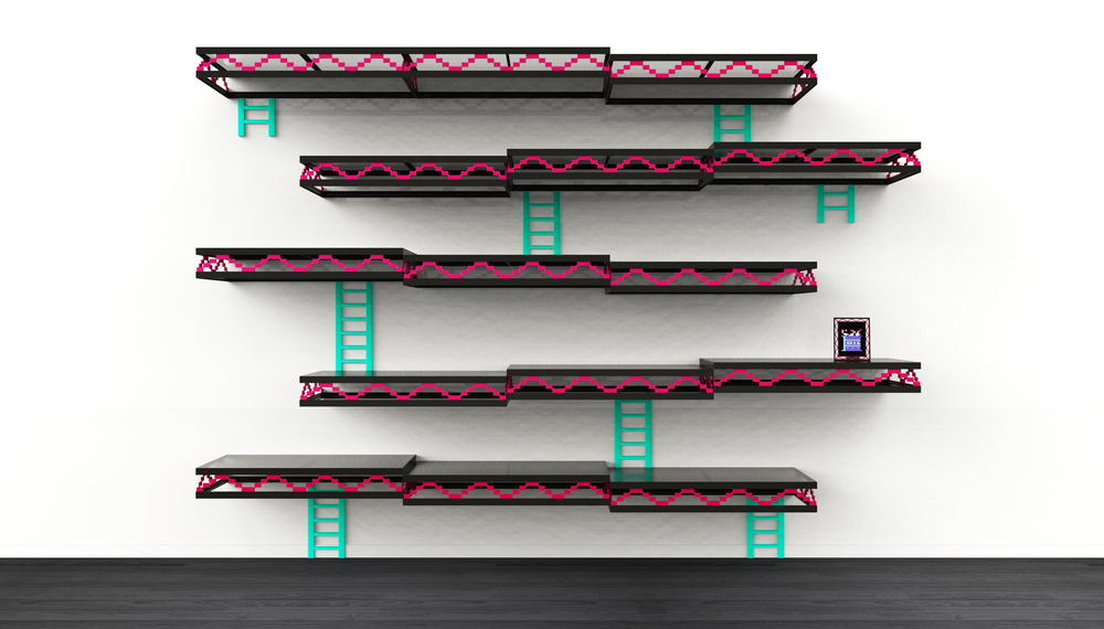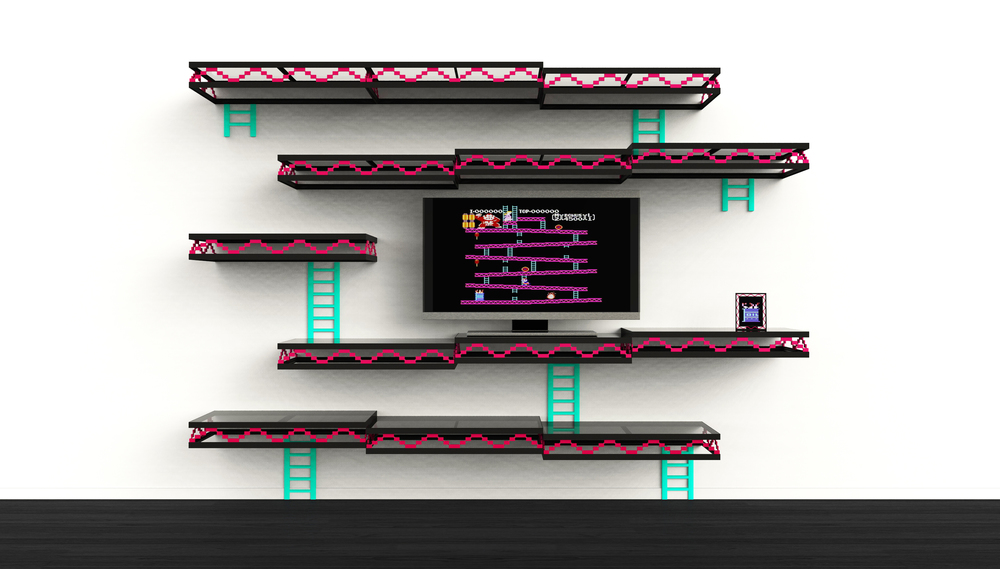 Donkey Kong Wall顧名思義,即以大金鋼中爬梯場所設計成的造型櫃,所有櫃架與遊戲中一樣帶點不規則感,全部採用輕量化的碳纖維材質製成,每組架子可承受60磅重量,彼此間以不銹鋼棒與鋼化玻璃連接,再搭配醒目的綠色梯子,栩栩如生到讓人想要縮小去挑戰看看,若是在中間擺一部電視打電動就更完美了!