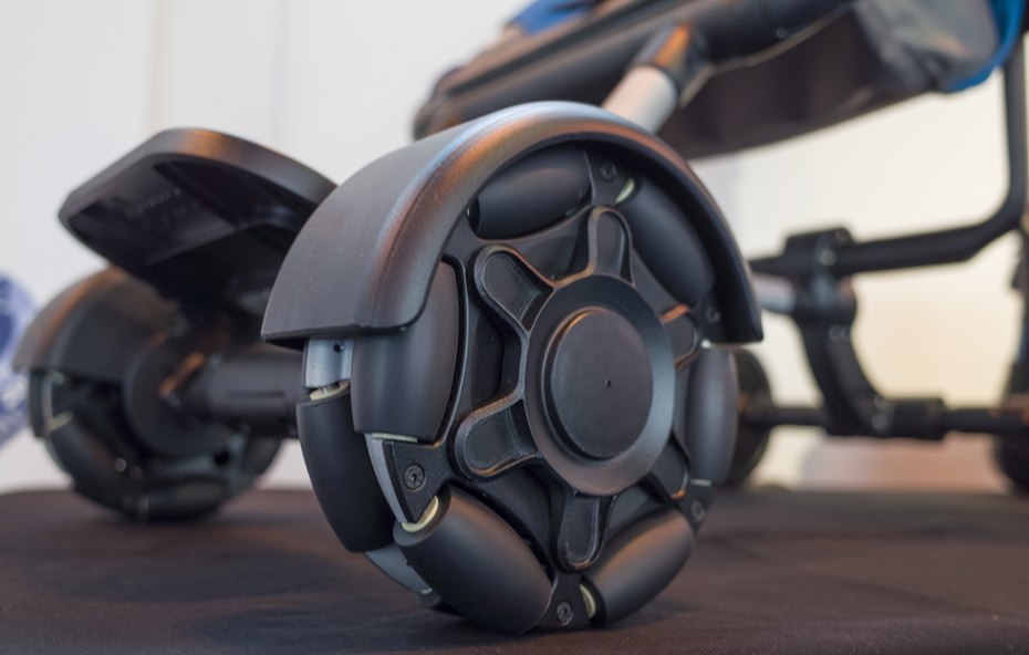 ▲ 設計師表示這款推車就是設計給有帶小孩旅遊或剛學步的小孩家庭使用的,這台推車可以從6個月大的小嬰兒到22公斤的小朋友使用。而且OmniO Rider除了折疊後可當成背包背的特殊性能,另ㄧ個獨特的性能就是全方位的車輪控制,推車車輪的設計,是可以360度旋轉,而且輪胎的材質還是有防刺的功能,讓這台推車相當適合帶出遊,不論任何地形都能輕鬆移動。