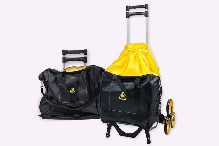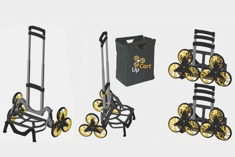 UpCart手拉購物車最特殊之處在於,有別於普通手拉推車輪子多採用單輪設計,UpCart配備的兩組輪子處皆以三個輪子組成,如此當遇到樓梯要爬上爬下、或任何有障礙物的不平坦路面都能順利通過。不僅如此,UpCart還配備可調整高度的把手,可依據使用者身高調整到理想位置;不過很重要的承載部份,UpCart最高能承受150磅重量,約將近70kg相當於一位成人體重,如照片中可見要用來運送箱裝雜物、油漆筒…等重物都不成問題。另外UpCart還採用超貼心的折疊設計,不使用時也可以收納起來節省空間。