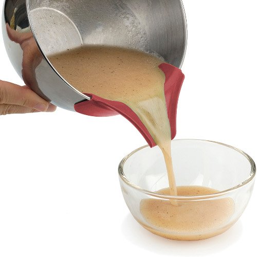 ▲主要就是簡單的無毒矽膠漏嘴,能掛在鍋具上面。這樣要從湯鍋裡倒出湯汁時,就能順利的從漏嘴中流出來。矽膠耐熱230度左右,所以即使是熱湯,也可以使用。除了可以掛在湯鍋邊緣外,ㄧ般大碗或炒菜鍋也可以使用。還有另ㄧ個過濾片,加裝上去就可以只倒出湯汁而已。
