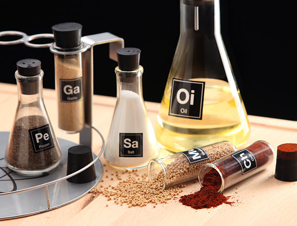 Spicey Chemistry 把家用調味料瓶罐,仿造成化學實驗室中的玻璃瓶罐。ㄧ共有13個實驗室造型的調味料玻璃空瓶,每個空瓶上也有類似化學元素的標籤,有化學元素表的感覺。