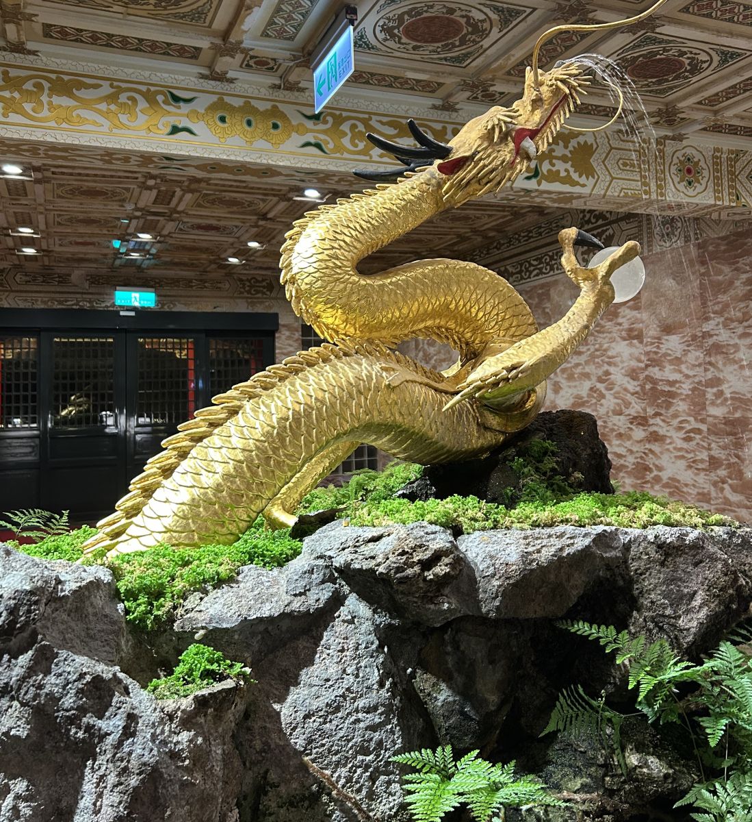 金龍餐廳位於圓山飯店正館後方,從大門進入後沿著大紅樓梯一路走上去,穿過走廊、經過鎮店之寶「百年金龍」噴水池,右轉便能抵達。若是開車前來,也能順著車道繞至後方,在金龍廳入口下車。