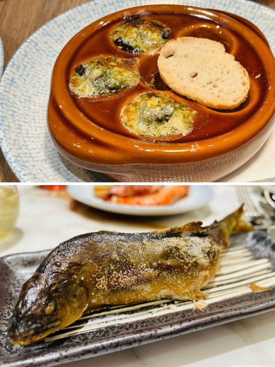 (整隻烤香魚,外面居酒屋隨便都是200元一尾。法式烤田螺,搭上法國麵包有夠涮嘴)