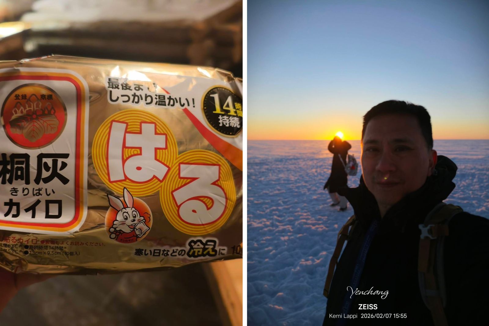 暖暖包建議買日本可以黏的那種常效型,極地每天兩包,黏在外套裡頭左右各一包。有一種韓國號稱軍用的,那個非常燙,放身體裡頭會太燙,還有種放鞋子暖暖包也不建議,同團有幾位有帶去用,結果太熱太燙。