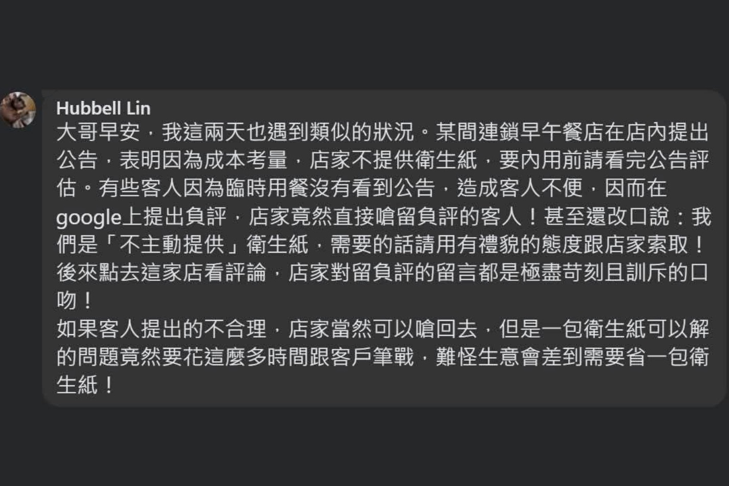 有些客人因為臨時用餐沒有看到公告,造成客人不便,因而在google上提出負評,店家竟然直接嗆留負評的客人!甚至還改口說:我們是「不主動提供」衛生紙,需要的話請用有禮貌的態度跟店家索取!
