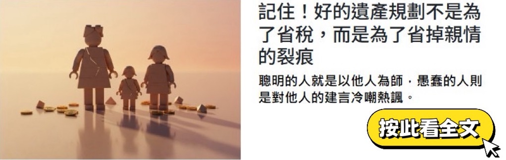 今天要談的,是:「遺產規劃最後一塊拼圖」。就算你現在還沒成為高資產族,也值得一看。誰知道十年後的自己會變成怎樣?