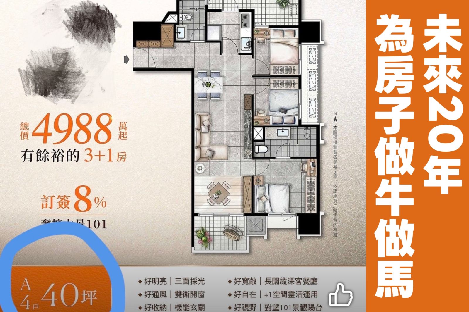 各位看一下左下方,它說坪數40坪,公設算35%就好,那這個房子只剩26坪。如果自備款算20%,必須要有997.6萬,假如貸款20年,以2%利率估算,每個月大概要還21萬,年輕夫妻根本沒辦法負擔。