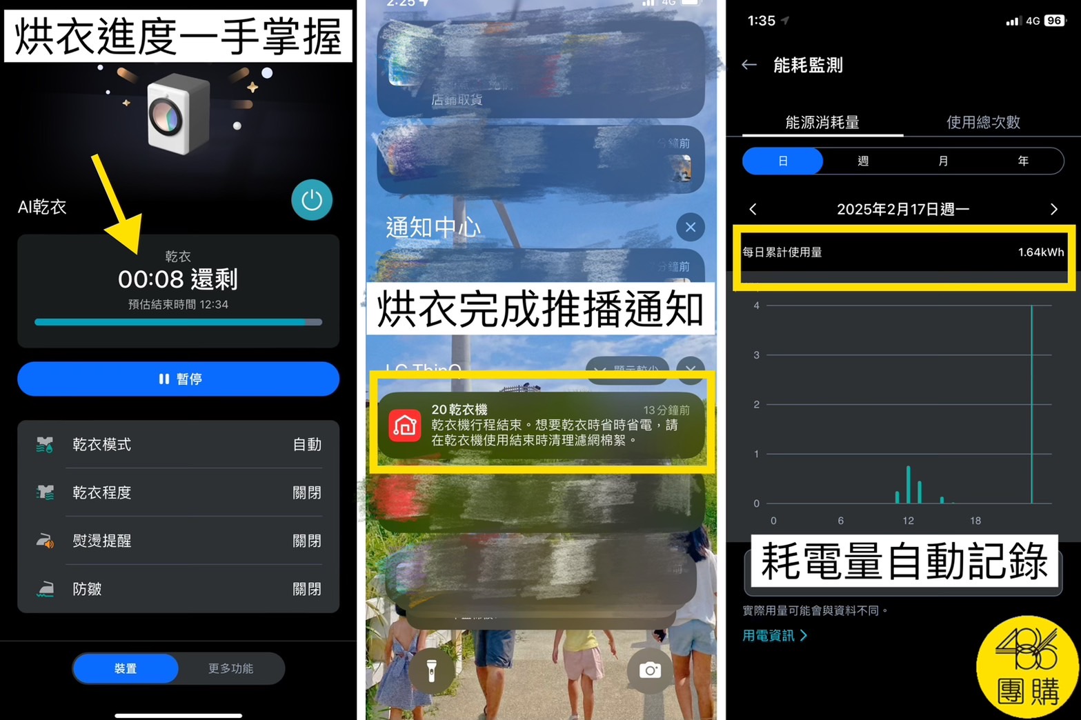 二在APP上操作,有更多雲端行程可以選擇,乾衣進度也能一手掌握,更棒的是還能看耗電量,每日、週、月、年都有圖表紀錄,真的很省電,像這張截圖,我烘完一桶衣服,時間約1個半小時多,總耗電量只有1.64kWh。