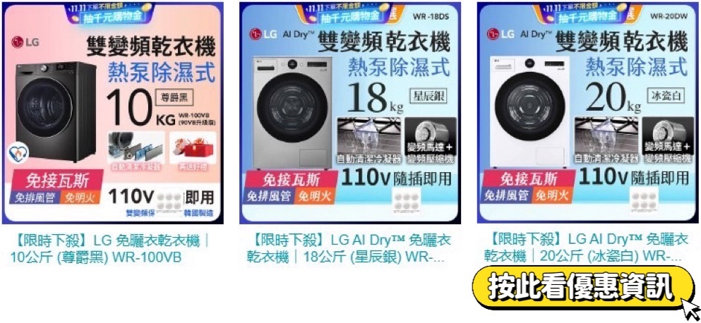 | 486尊爵黑!LG雙變頻免曬衣乾衣機10公斤 獨家限時加碼優惠會會 | 另有白色大容量!LG雙變頻免曬衣乾衣機20公斤 獨家限時加碼優惠 |