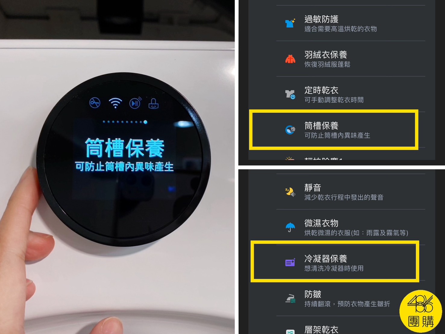 這台除了會自動清潔冷凝器外,還有「冷凝器保養」行程,自己在家就能進行例行性大保養,避免微塵堆積,維持乾衣高效能,也能延長機器壽命。