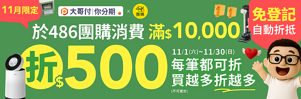 486團購×台灣大哥大 11月推出「大哥付你分期」活動,只要你是灣大哥大手機用戶,訂單滿萬元、結帳方式選「大哥付你分期」,總金額直接再多折500元。