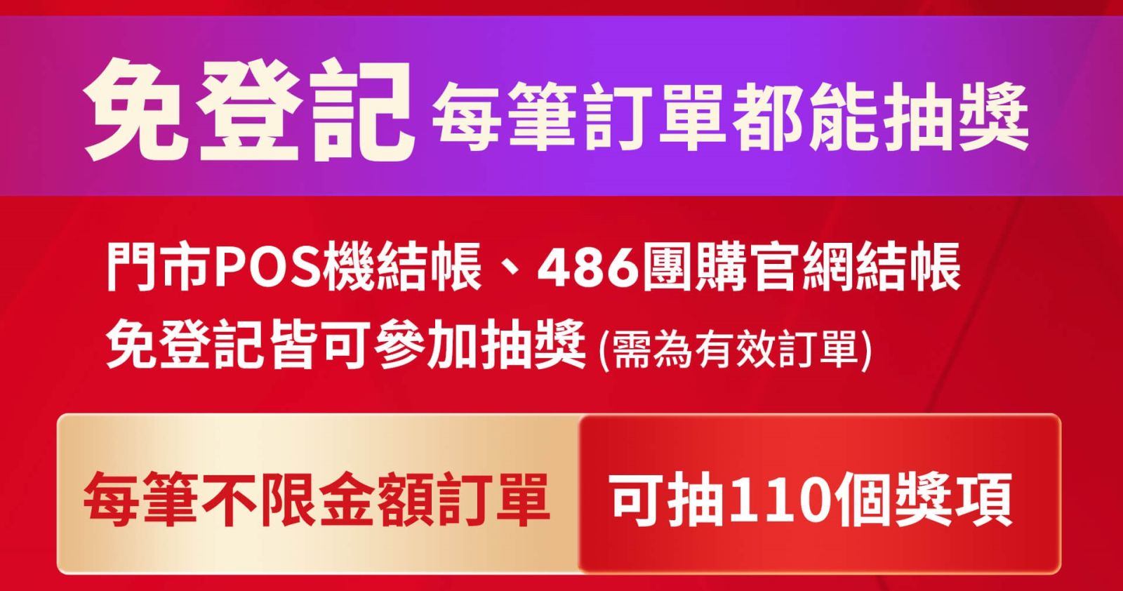 - 活動方式:每筆訂單不限金額,均可「免登錄」參加抽110項好禮(買越多,中獎機率越高)
