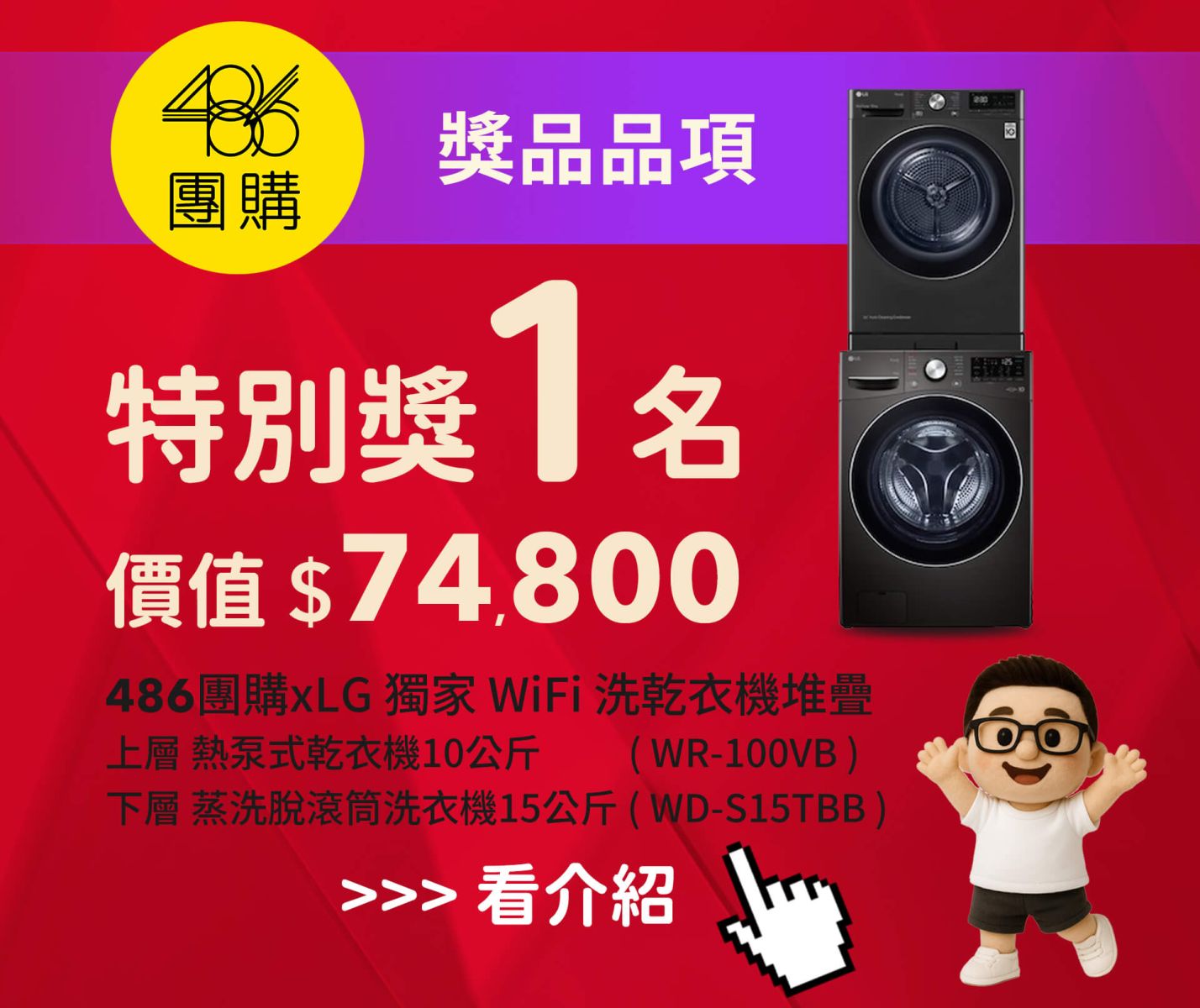 - 活動方式:單筆訂單滿1萬元,可免登錄抽「特別獎」 — 486×LG獨家尊爵黑洗乾堆疊組(蒸氣洗滾筒15公斤+熱泵式乾衣機10公斤),市價約7萬5。