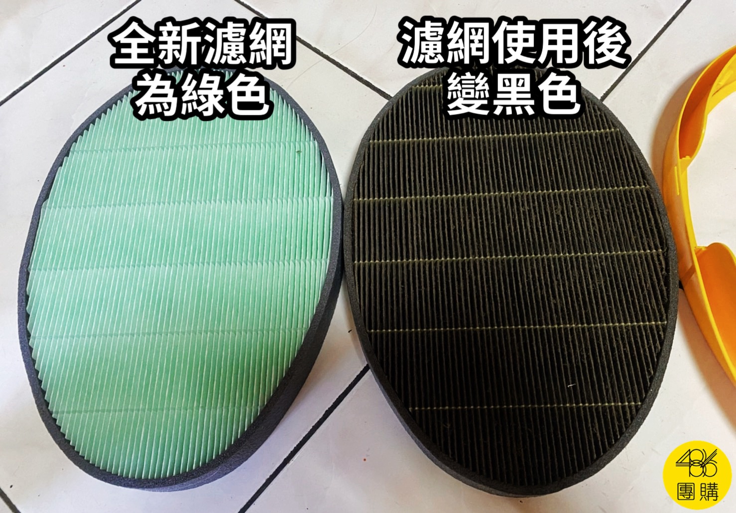 新的、剛用的濾網是綠色,使用一陣子後會變成「灰色」,這是空氣中細小pm2.5懸浮微粒、大顆粉塵、花粉、棉絮、毛髮等被攔截的證據,代表清淨機有在努力工作。