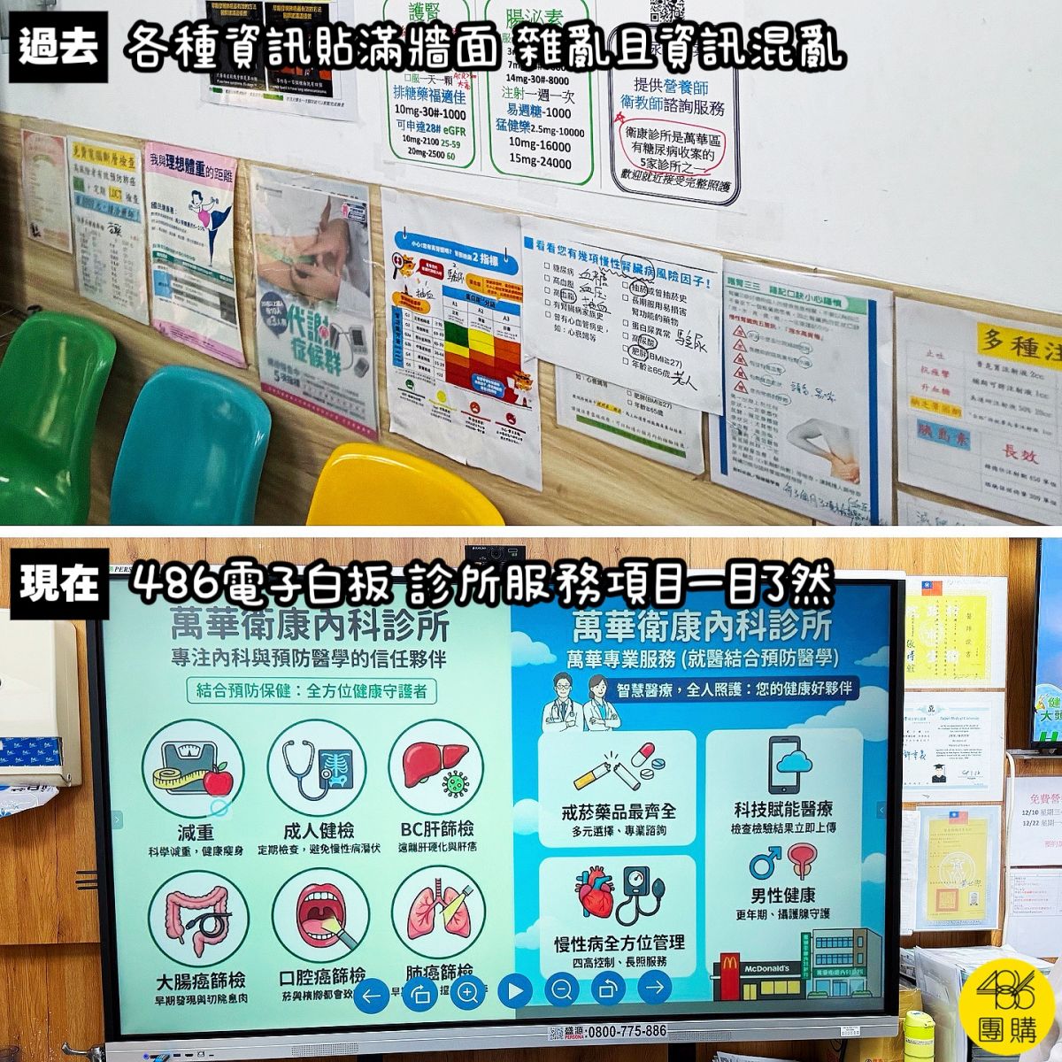 我自己走進診所就很有感,以前那些貼滿牆卻沒人看的海報、不易維護的跑馬燈,其實早就跟不上現代節奏,486電子白板這種「一台搞定、隨時可更新、自己就能操作」的工具,真的非常符合第一線診所的實際需求。