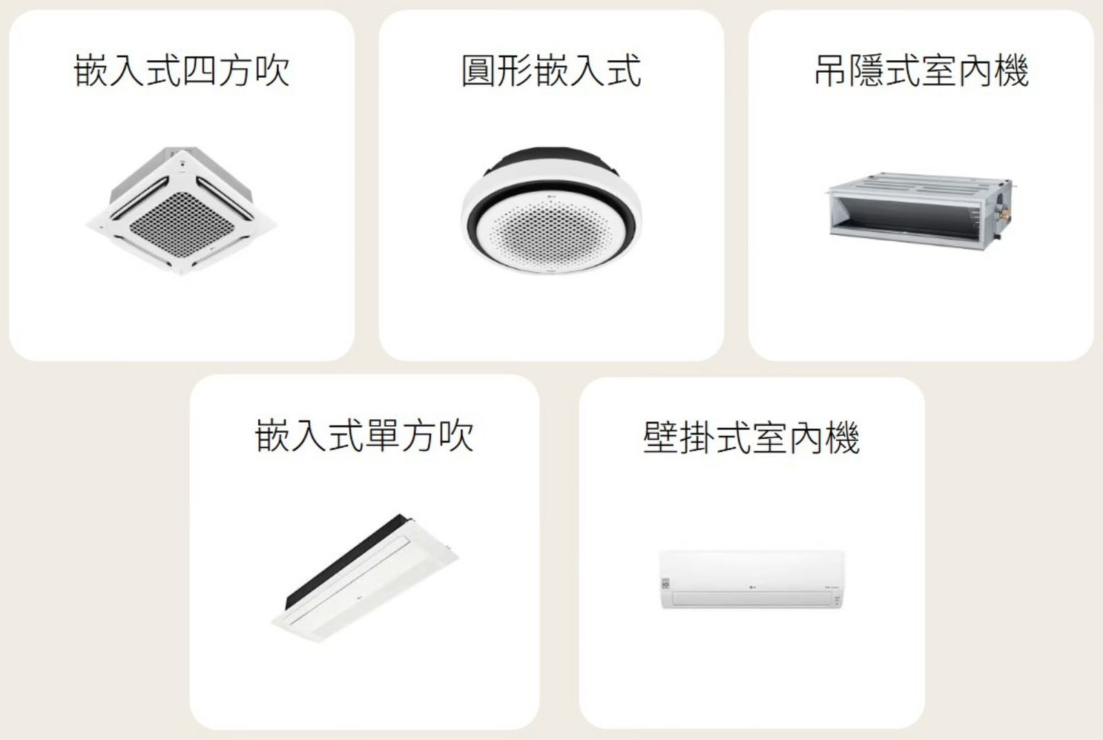 ▴針對不同環境及需求,有嵌入式四方吹、圓形嵌入式、吊隱式室內機、嵌入式單方吹、壁掛式室內機等多種配置選擇