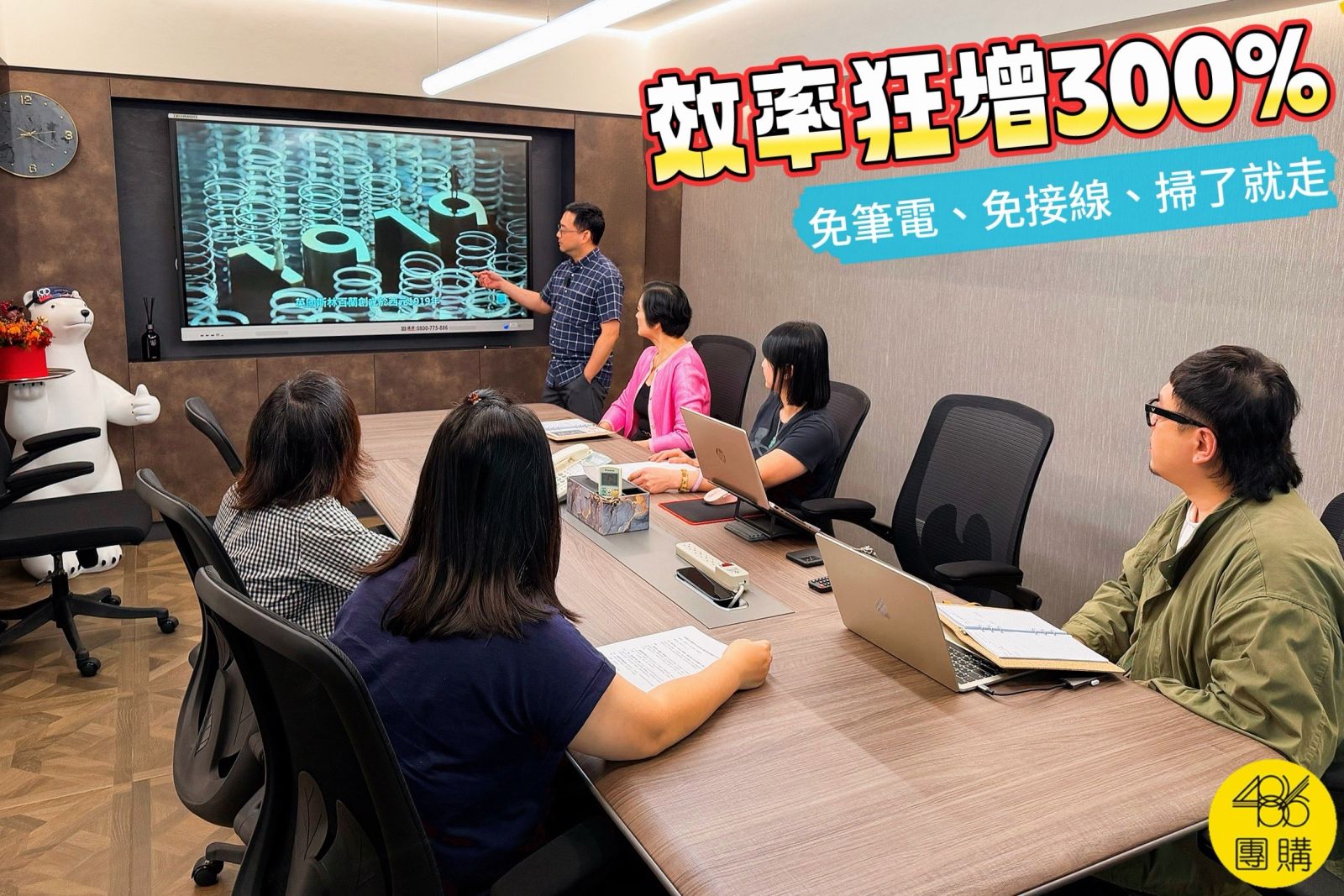 - 免帶筆電、無線投影:486觸控式電子白板支援有線和無線投影,現在有些同事甚至不需要帶筆電,直接手機投影上去就可以開始做會報,不用找線、接插頭真的很方便。