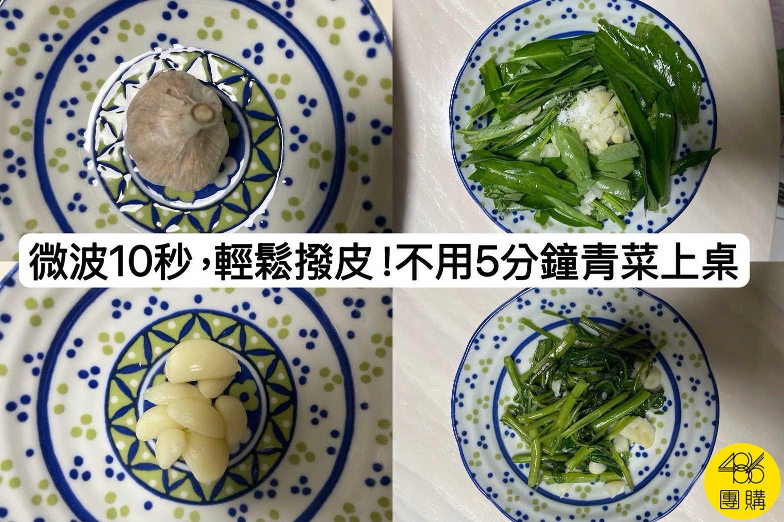 只要微波蒜頭 10 秒,外皮立刻鬆開,輕輕一捏就能去皮,不怕沾手也不浪費時間。撥好的蒜頭馬上就能微波炒青菜,營養滿分又方便,美味上桌更快速!