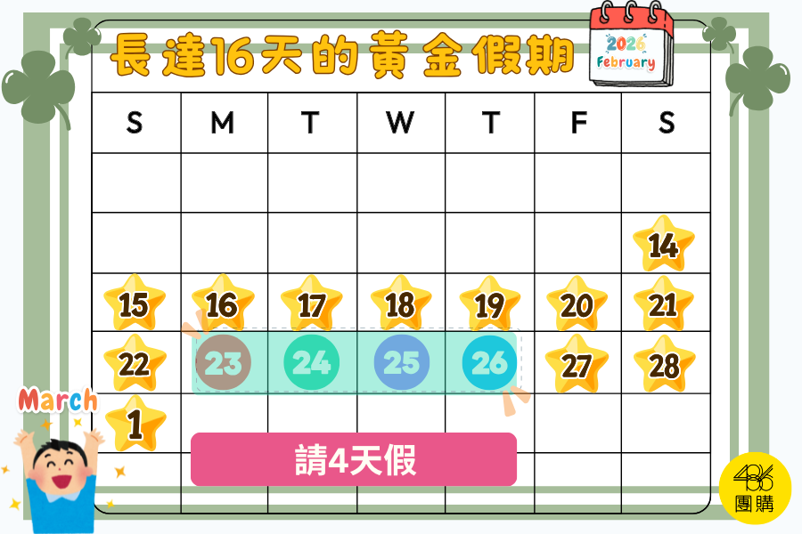 如果你在春節結束後的 2/23~2/26 這4天請特休,就能把春節9天假+228連假3天串起來,直接爽放16天超級黃金假期!