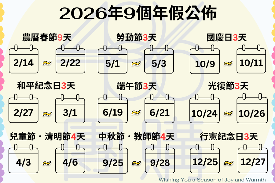 根據公布的行事曆,2026年共有9個3天以上連假: