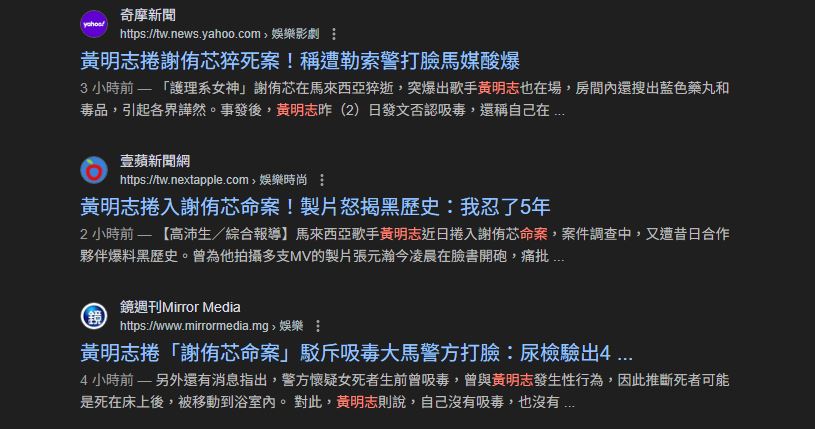補充說明:黃明志有發表聲明說沒有碰毒品。馬來西亞警方說驗尿結果呈現毒品陽性。