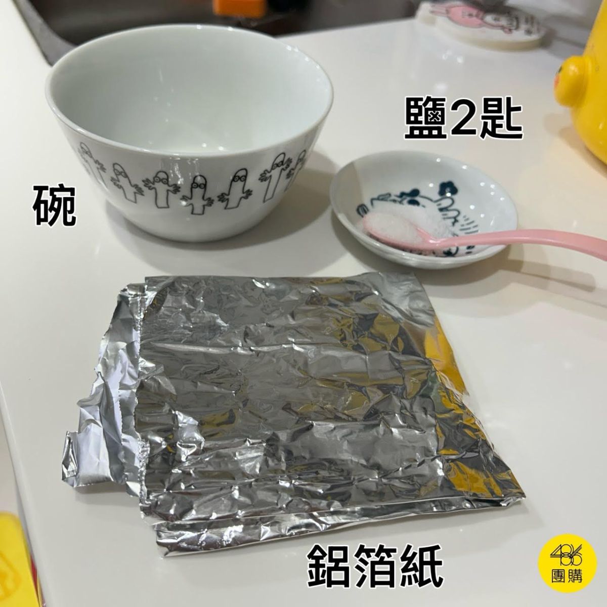 - 碗、鋁箔紙、鹽巴、熱水、紙巾或拭銀布
