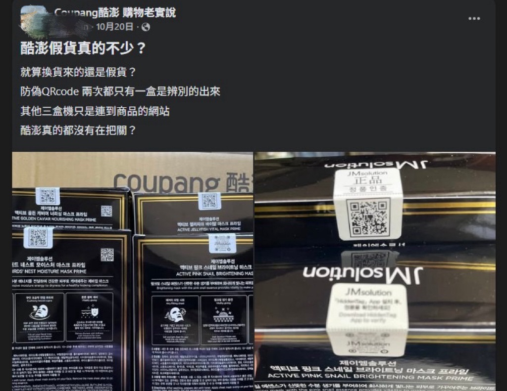 截圖自/Coupang酷澎 購物老實說,反映換貨後還是假貨,防偽QRcode無法辨別