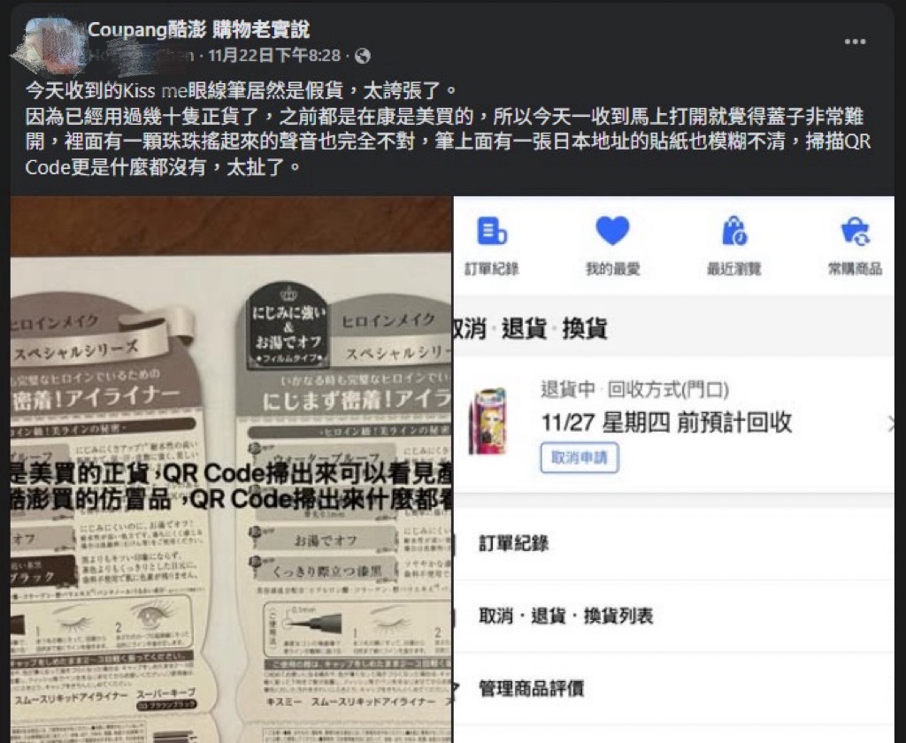 截圖自/Coupang酷澎 購物老實說,反映眼線筆買到假貨,QRcode掃了沒東西