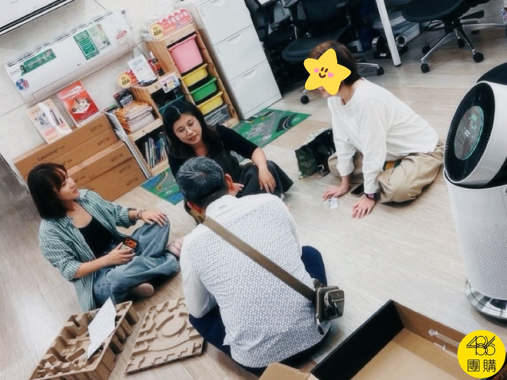 就這樣,我們現場服務人員直接跟他們一起坐在地上開箱(我們進來要換室內拖,地板每天都有掃地機自動掃+拖,非常乾淨),幫他們組裝、教他們怎麼用。