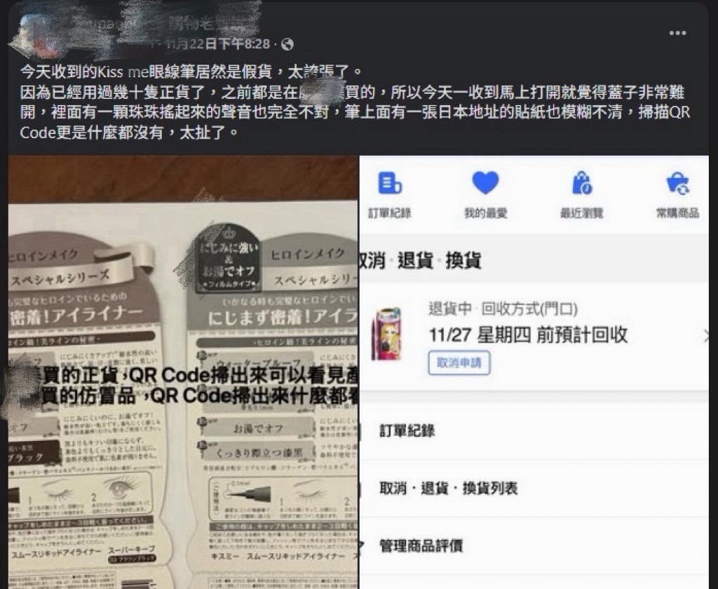 截圖自/酷X 購物老實說,反映眼線筆買到假貨,QRcode掃了沒東西