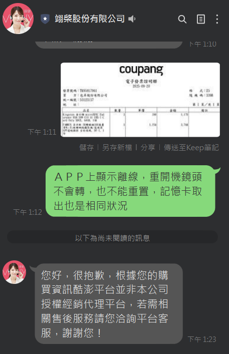結果其中1支監視器用沒多久出現異常,跟原廠官方APP報修,得到的結果竟然是「酷彭非授權經銷商,不予保固」!