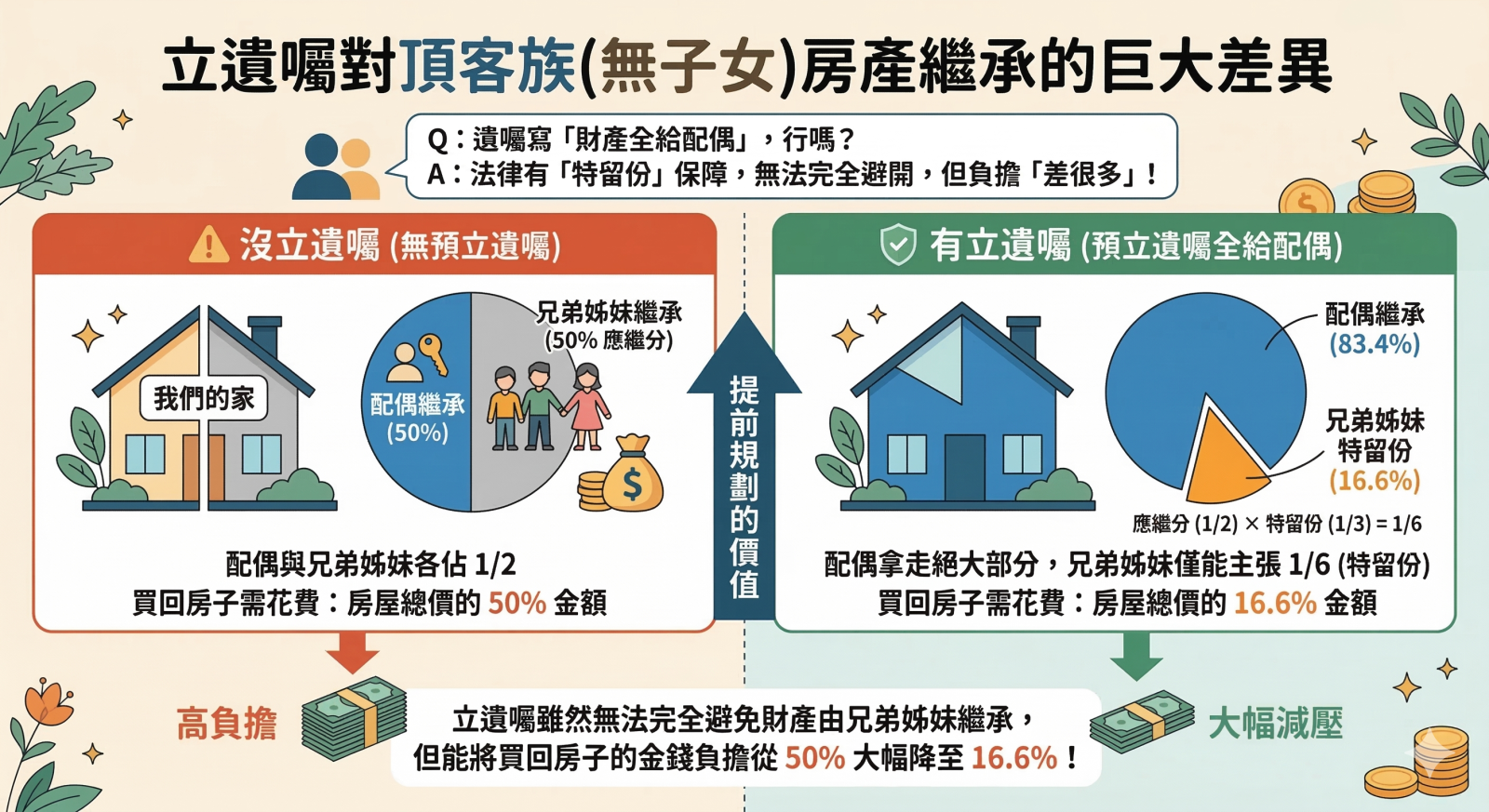 雖然立遺囑無法完全避免財產由兄弟姊妹繼承,但有提前規劃還是比沒規劃好非常多,以買回房子這件事來說,所需要花費的金錢負擔就從原本的50%降到16.6%。