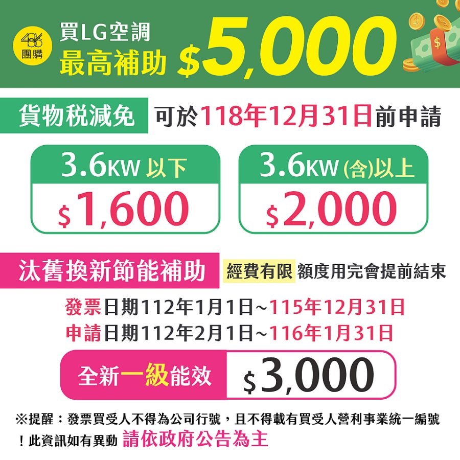 我們無法左右接下來的會議結果,但可以趁現在政府的5,000元補助還在,趕緊把家裡夏季三大吃電怪獸換掉,免費補助入袋,還能省下好幾千元、甚至萬元的電費。