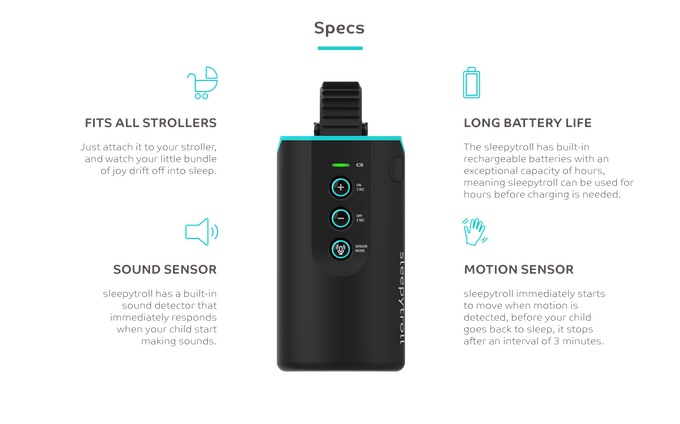 ▲ Sleepytroll 是ㄧ個能把嬰兒推車變成嬰兒安撫搖椅的機器,能隨身攜帶,放在嬰兒車的置物籃裡就可以,只要外出時需要使用,拿出來掛在推車手把上,就能馬上將普通的推車變身為安撫嬰兒搖椅。讓寶寶可以安穩的在推車裡睡覺,爸媽們就可以舒服愉快的享用餐點或逛街啦!