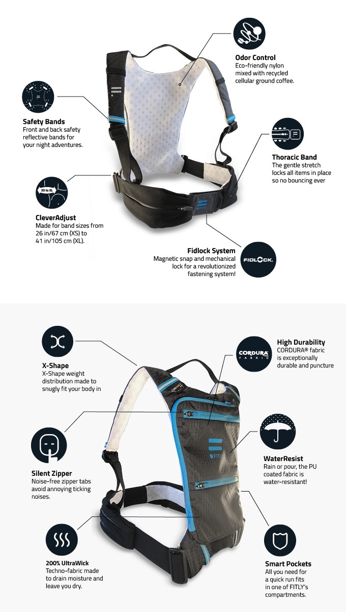 ▲ FITLY是ㄧ款專為跑步設計的後背包,能裝進相當多用品,譬如水壺、鑰匙、手機或ㄧ些簡易的食品。而且FITLY的設計相當貼身,好像穿上ㄧ件貼身背心ㄧ樣,所以當物品放進背包內時,這些物品並不會上下晃動,讓你覺得不舒服。